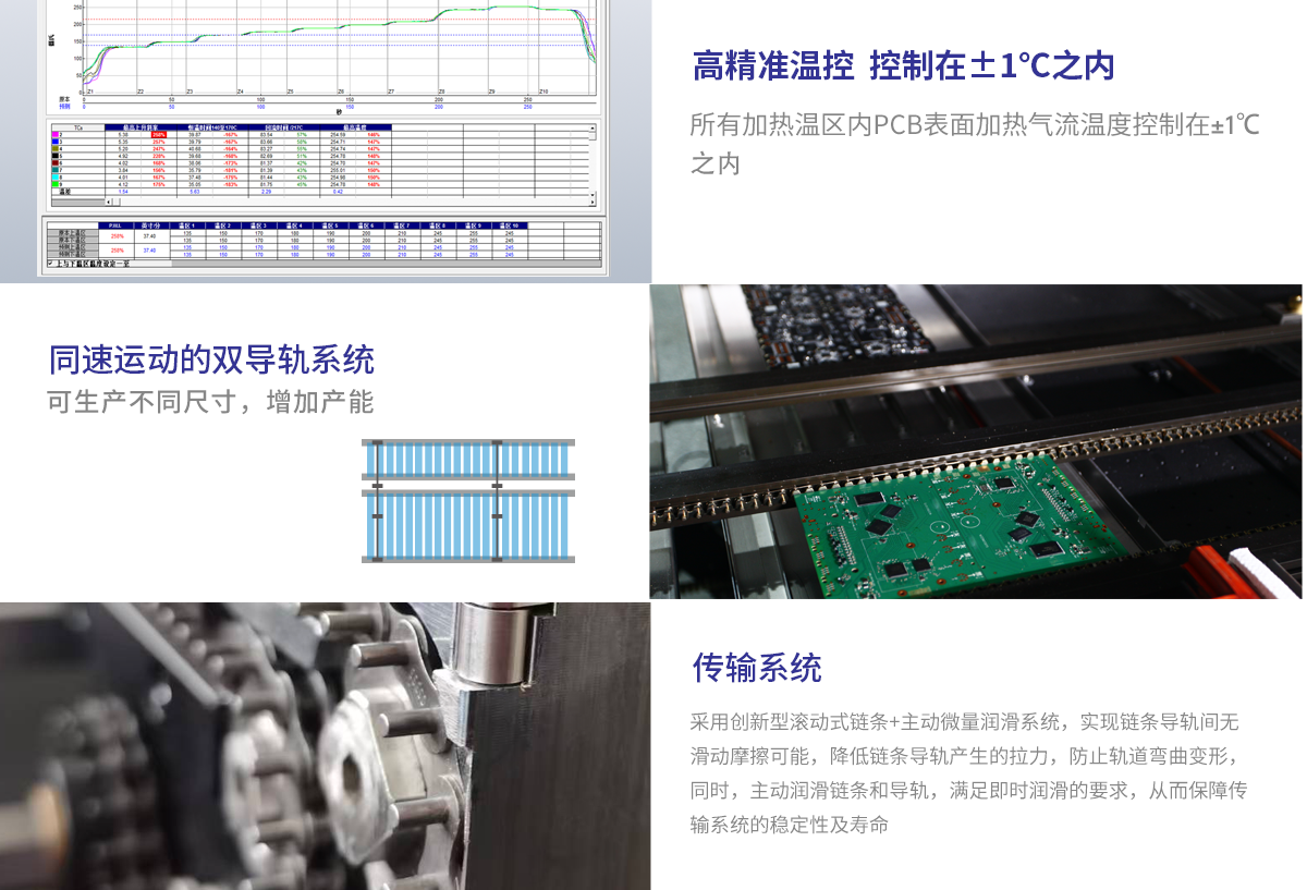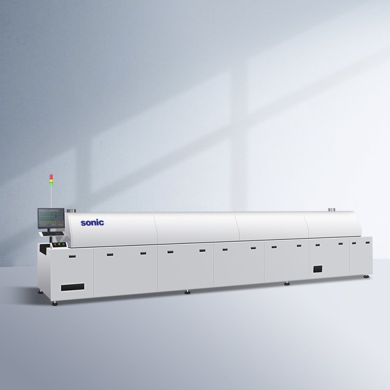采用了自主研發(fā)的高靜壓熱風(fēng)循環(huán)加熱技術(shù),滿足陶瓷BGA等大型元器件與高密度小型元器件換在PCBA產(chǎn)品的焊接要求,SONIC回流焊每區(qū)的有效加熱長度比率>84%