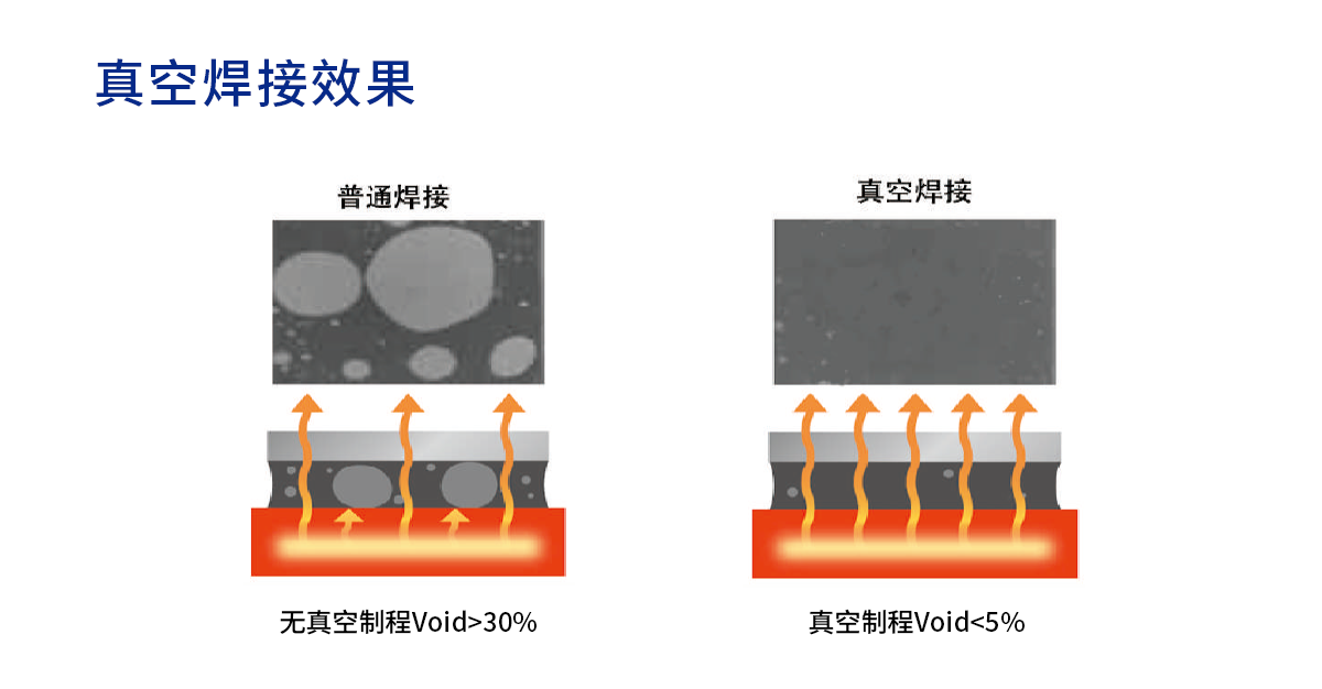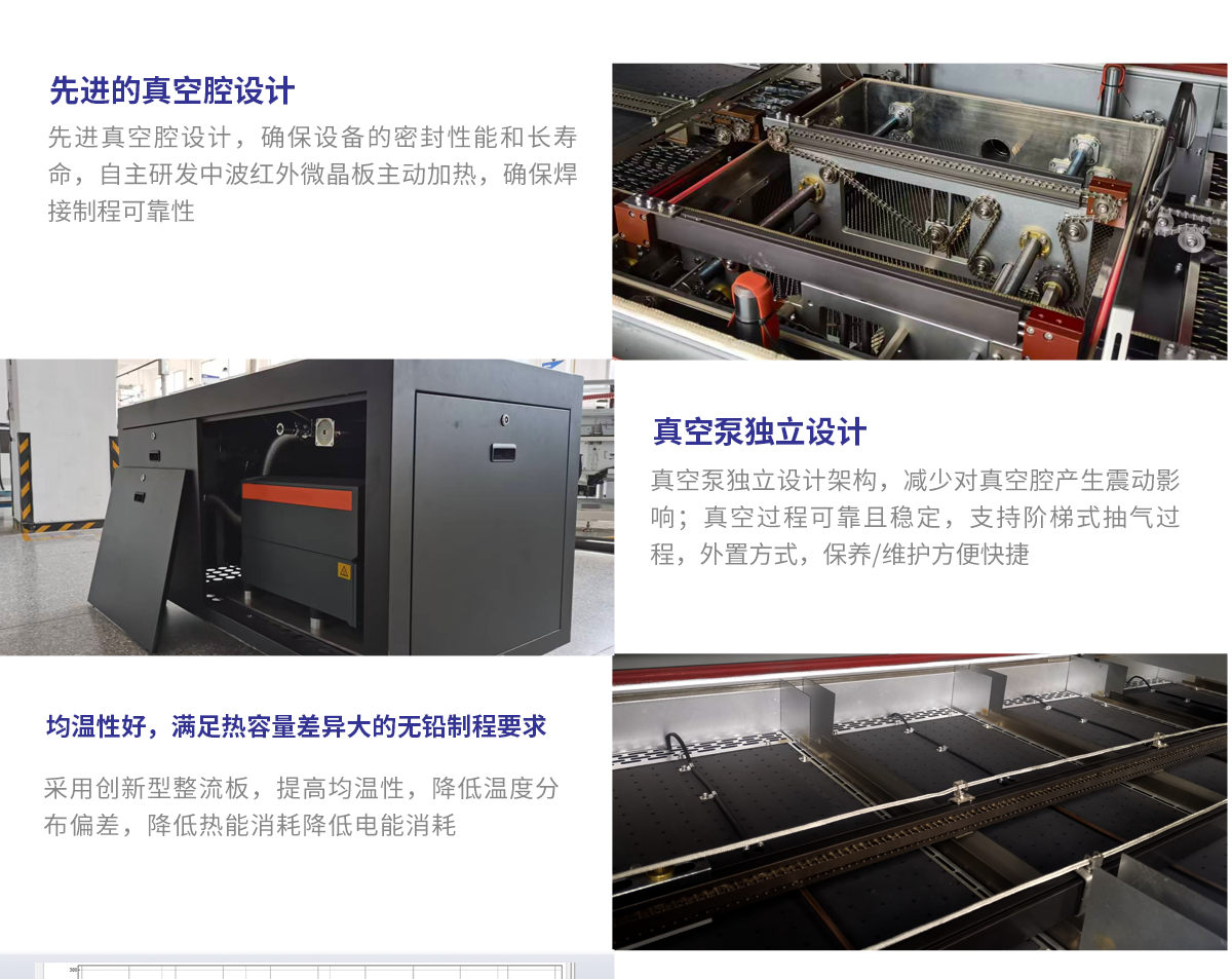 設(shè)備集大規(guī)模穩(wěn)定量產(chǎn)的熱風(fēng)回流焊與真空焊接為一體,為客戶提供自動化在線式、低空洞( 總空洞面積小于5%)、高產(chǎn)量焊接設(shè)備,真空模組安裝在回流爐內(nèi),能精準(zhǔn)調(diào)節(jié)抽真空的速度并可完成普通回流爐的溫度曲線,實(shí)現(xiàn)在線焊接。